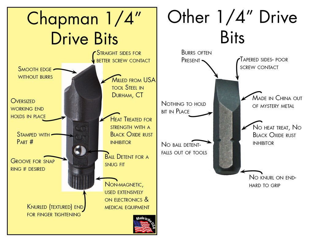 Chapman versatile Adapters are constructed of the highest quality Chrome Nickel Molybdenum Alloy Steel and precision made to ensure a proper fit. Their dual purpose knurled Spinner Tops allow for quick finger tightening of threads and for instant "push down" removal of the adapter from the ratchet. Ball-detents plus 'ear' stops quickly position and secure each adapter in the ratchet, the extension, or the screwdriver handle.